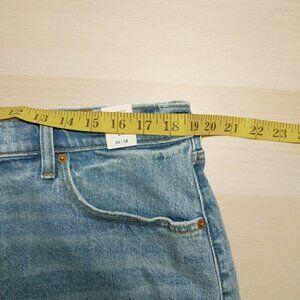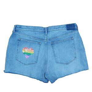NWT ABERCROMBIE & FITCH Medium wash, nice colorful sequins heart on the back pocket, high rise, zipper fly, raw hems, mom shorts, size 34/18. Nice quality 99% cotton denim fabric with just a tiny bit of stretch to it.