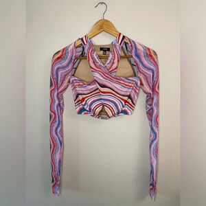 Brand new never worn! Amazing multicolour top! give 'em psychedelic sass. This crop top has a mesh construction with a colorful trippy print all over, long sleeves with thumbhole cuffs, and a halter neck wrap design with adjustable tie back closures.