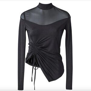 NWT AMYSHEHAB BLACK NOIR MESH CINCHED LONG SLEEVE TOP, this is a Black Mesh Turtleneck Back zipper Long sleeve with drawstring super stertch and glowy shiny top - formal and super comfy with an asymmetrical hemline - back zipper fastening - evening formal clubwear / club night out chic and sophisticated yet sexy top with fitted long sleeves, perfect for holiday's seasons, party, first date and cocktail with a mini skirt or a leather pants.