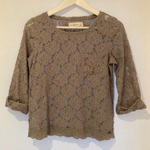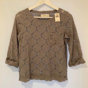 NWT Abercrombie & Fitch Kylie floral lace scoop neck grey shirt women's size small. 3/4 length cuffed sleeves, pocket, slightly cropped style, and metal logo. 52% cotton. 48% nylon.