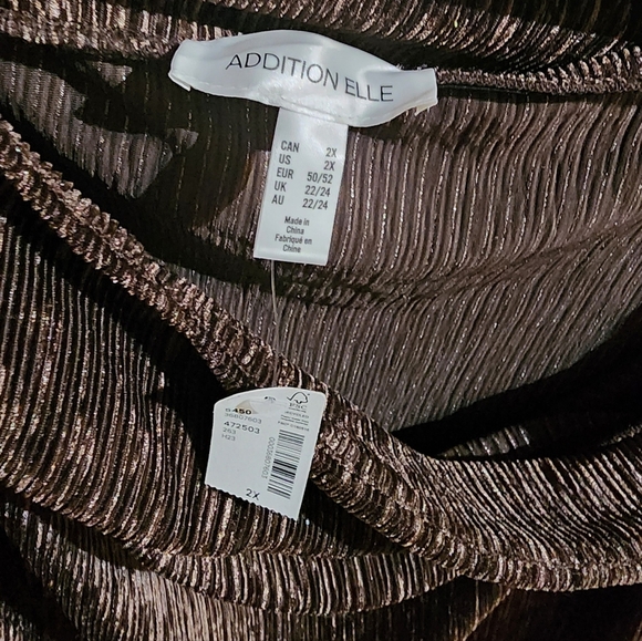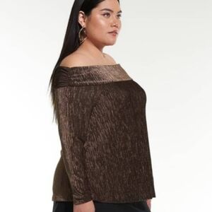 Step into the season with this Addition Elle chocolate brown metallic pleated top, the perfect blend of fall luxe neutrals and holiday-ready shimmer. With an off-the-shoulder neckline and long sleeves, it flatters every curve while keeping you chic from pumpkin spice outings to New Year's Eve parties. This top purchased at Penningtons is NWT and size 2X