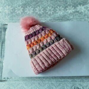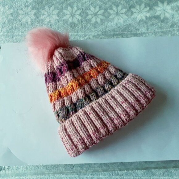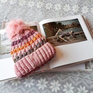 NWT Adrienne Landau pink and multicoloured stripe knit beanie hat with faux fur pom pom detail