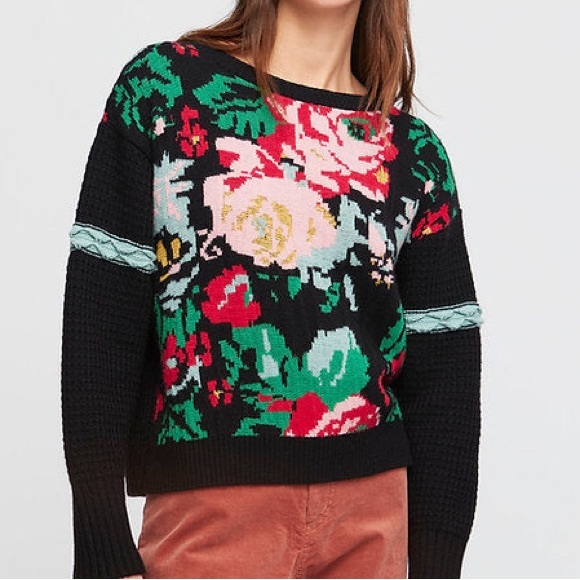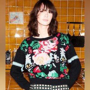 New with Tags- AldoMartins. This stylish floral knit sweater features a vibrant design on a black background, perfect for adding a pop of color to your wardrobe. Ideal for casual outings or cozy days at home.