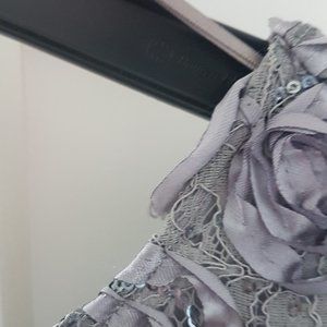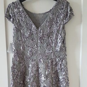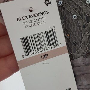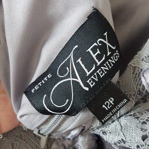 NWT Alex Evenings Tea Length Dress with Rosette Detail Dove Grey 12P Petite