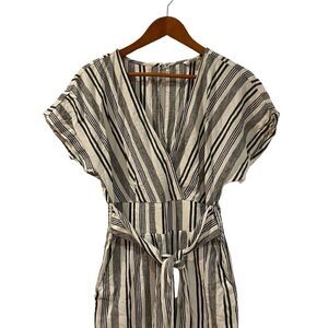 This American Eagle Linen Blend Striped Romper is brand new with tags! Made from a soft cotton and linen blend, this romper features a flattering tie waist and a chic striped design. Perfect for casual outings or as a stylish summer piece.