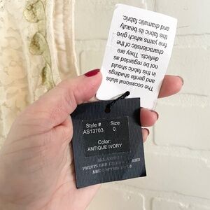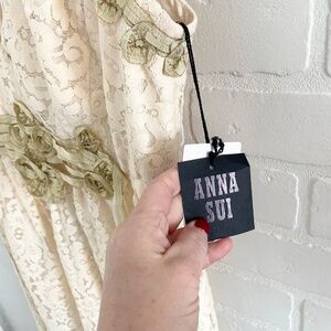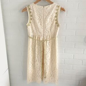 This is a stunning Anna Sui gown in size 0. It is a sleeveless gown with a delicate lace tteimed V neckline. The gown is made of a sheer, cream color lace with a cream lining. It features a gold rosette waistband, a lovely tie-back ribbon and a back zipper closure.