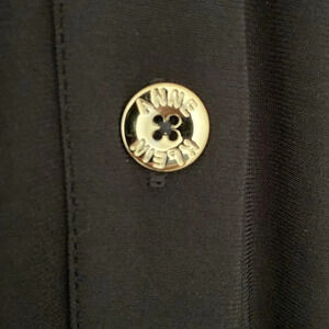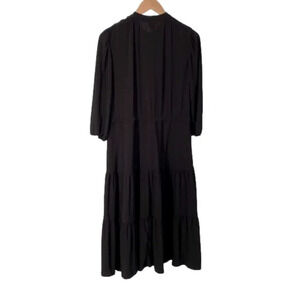 DESCRIPTION: A comfortable and pretty midi dress that rethinks a peasant silhouette. Pulls on. Unlined. Ties at waist with a tiered skirt. Gold button down front stands out on the all black material.