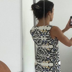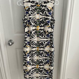 Show stopper Summer Celebration dress! Beautiful pattern in black, yellow, blue on white. Cotton 97% 3% Spandex. Size 2. 14" waist, 38" length. Lined. I think it can fit a size 0, size 2, or size 4 (there's a bit of room for me in the size 2.)
