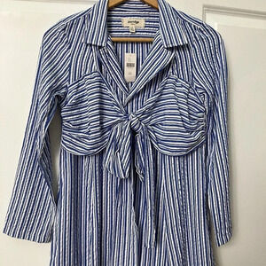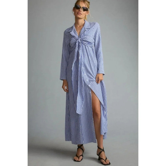 NWT Anthropologie Porridge Tie Front Blue White Stripe Crinkle Maxi Dress XXS