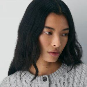 This is a crewneck cardigan with a relaxed fit. It’s knit with Aritzia’s Merino Wool — lofty 100% extra-fine merino wool yarn coveted for its natural warmth and soft feel. This luxurious yarn is made with responsibly sourced wool. This version is constructed using our Coastal Cable stitch, a classic cable-knit pattern with mixed decorative accents for a textural look and feel.