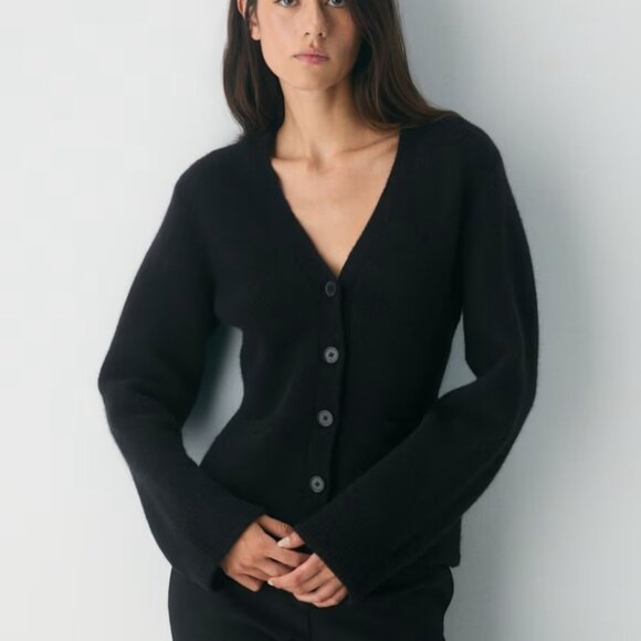 This is a V-neck cardigan with welt pockets and a slim fit. It's knit with extra-fine merino wool from a premier Italian mill. This lofty yarn provides equal parts warmth and softness. This garment is constructed using a Half Milano stich for structure and a flat, dense feel.