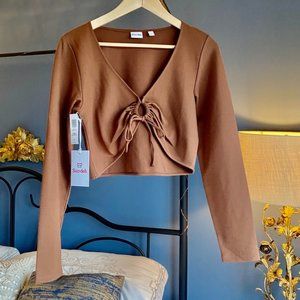 New with tags from Aritzia, Sun-Deh (Sunday Best capsule collection) Far Out long sleeved crop top in Epicurean Brown, size L. Adjustable O tie at front with v neck, very flattering. Really nice thick, soft, and smooth fabric. Cat friendly, nonsmoking home.