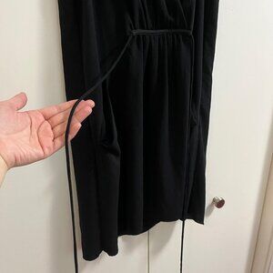 This is a sleeveless dress with a faux-wrap front and self-tie detail at the waist. It's made with a Japanese fabric that drapes nicely.