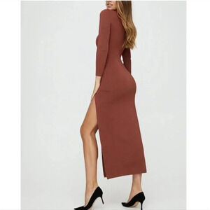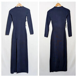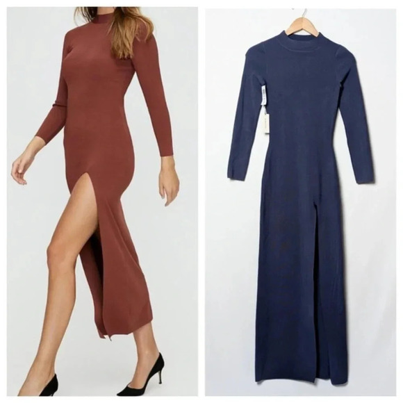 This is a long sleeve, mock-neck, bodycon maxi dress with a slit to the thigh. It's made from drapey fabric with a hint of stretch.