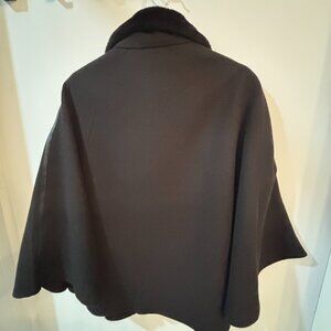 NWT BCBG women's cape coat in a rich black with faux fur collar and faux leather accents. Perfect classic luxury piece for fall. Drapes very nicely. Flattering on all body shapes.