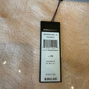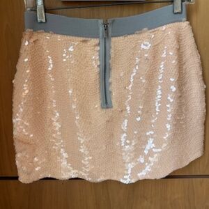 This is a brand new BCBG Max Azria peach sequin Michaela Skirt in size XS. It has layers of soft beige/peach sequins, grey waist band, zipper at back, and is lined. It has a scalloped bottom hem at bottom. It measures 14" in length, 18" at hips and 13.5" at waist. Perfect for a fancy party or New Year's Eve!