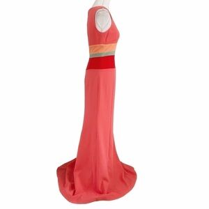NWT BCBGMAXAZRIA LIZETTE CORAL COLORFUL STRIPES V-NECK SLEEVELESS MAXI DRESS, This is a coral reef pastel colorful full length formal spring and summer dress - sleeveless - plunge v-neckline - concealed back zipper closure - lined - flowy - colorful striped waist for a sheath flattering look. Perfect for a bridesmaid dress, wedding guest outfit, prom, galas, ceremonies and more evening yet warm weather formal occasions. Vibrant, funky with lace up sandals or heels.