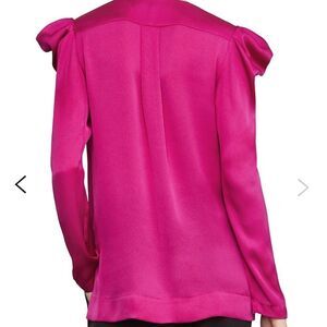 This long sleeve, faux wrap top in satin georgette features draped shoulders and a shirred yoke.