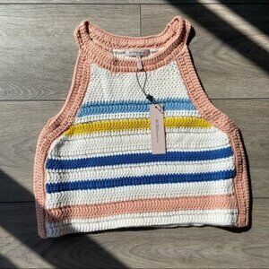 With a vintage-inspired vibrant palette, this high-neck cotton crop top is knit in a crocheted fashion, finished with a cropped hemline.