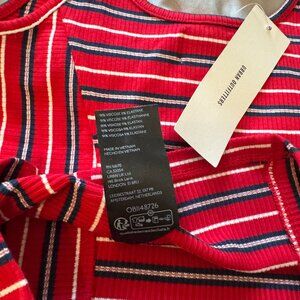 A bold red base with black + white stripes, ribbed knit texture, fixed spaghetti straps, and a fitted cropped silhouette. Super cute for layering or rocking solo