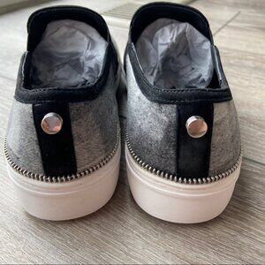 Scored leather and exposed zipper teeth add edgy dimension to a slip-on sneaker set on a sporty cupsole for trend-right style.