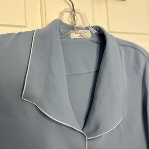 Effortlessly polished, the Babaton Rena Blouse from Aritzia features a silky smooth feel and chic, modern tailoring. Done in a soft “Dune Bluespace” light blue, this long sleeve blouse is designed with a relaxed fit, piped trim, and a draped collar for a refined minimalist look. A wardrobe essential for work or weekend wear.
