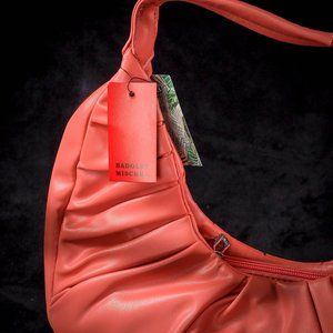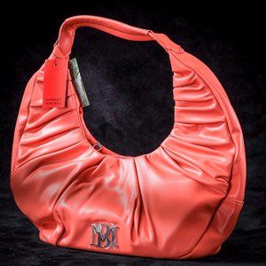 A crescent-shaped hobo bag with multiple interior pockets and a zip closure.