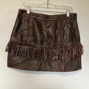 Elevate your style with this chic brown leather skirt featuring playful fringe details. Perfect for adding a touch of flair to any outfit.