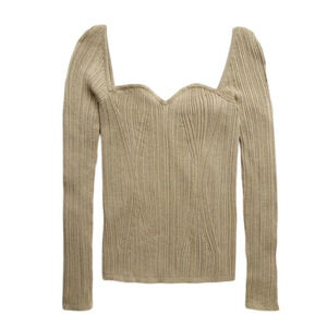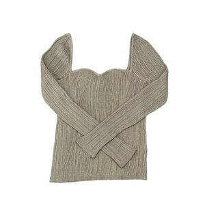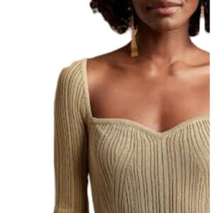 This Gold/Tan Knit Top by Banana Republic features a Sweetheart Neckline, long sleeves, and a ribbed knit texture, creating a fitted and elegant style.