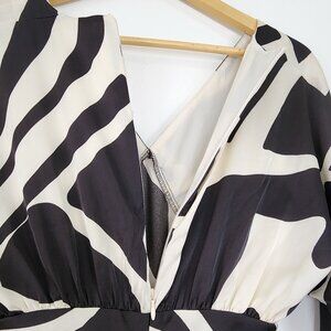 Banana Republic, Formal Dress, banana republic dress, abstract print dress, black and white dress, women's midi dress, V-neck dress, long sleeve dress, size 2 dress, modern style dress, elastic cuff dress, office wear dress, back zipper dress, Career Wardrobe, Modern, Satin Dress, Fall Fashion, Lightweight