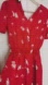 It's a size medium. It's a beautiful bright red with floral print and has a ribbon tie in the front. The back has a button closure and a slight open back detail. The material is lightweight and flowly its like a silk material.