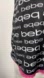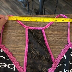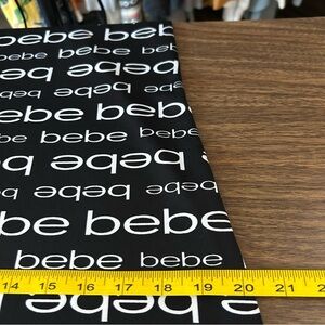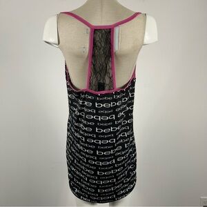 Stylish black chemise with pink trim. Features Bebe logo pattern. Ideal for lounging.