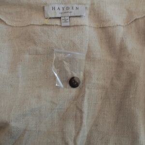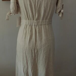 A new with tags on Hayden LA beige linen dress, with coconut buttons. The waist band is tapered with elastic in back, and the sleeves tie with self fabric strips.