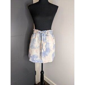 skirt has a tie belt, cute pale pink and blue tie dye pattern, side seam pockets and a notched hem with raw edge trim.