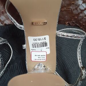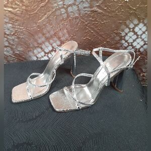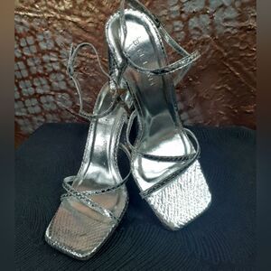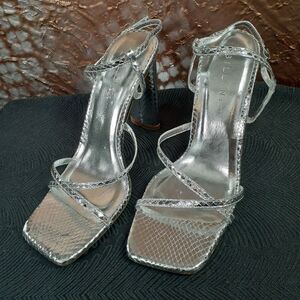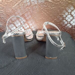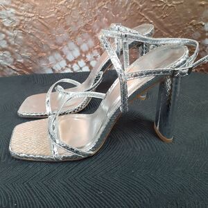 brand new with price stickers still on soles, strappy silvertone faux leather snakeskin embossed strappy heeled sandals. silber buckle detail witj square toe. sculptural chunky heel. slight scuffs on inside of right shoe (see pics for reference), will be reflected in the price! purchased at The Bay. size 7, 4" heel.