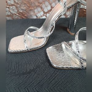 brand new with price stickers still on soles, strappy silvertone faux leather snakeskin embossed strappy heeled sandals. silber buckle detail witj square toe. sculptural chunky heel. slight scuffs on inside of right shoe (see pics for reference), will be reflected in the price! purchased at The Bay. size 7, 4" heel.