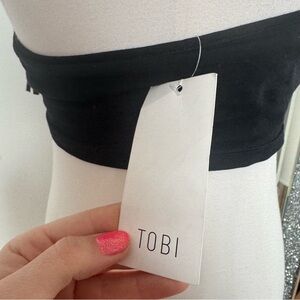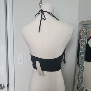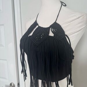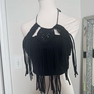 Stylish black halter top with fringe detailing. Perfect for a chic, bohemian look.