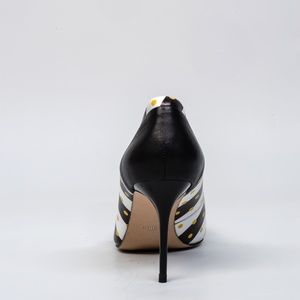 This is a genuine black matte leather heel with printed heel of black and white stripes sprinkled with goldish polka dots. The plain glossy black heel is approximately 3’’ high.