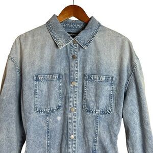 This NWT! Blank NYC Light Denim Shirt in size small is brand new with tags. Featuring snap button closures and a comfy elastic waist, this shirt is a super cute and versatile piece perfect for casual wear. The light denim fabric makes it an ideal choice for layering or wearing on its own.