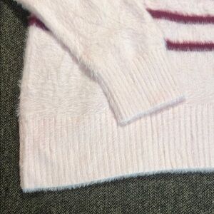 Stay warm and stylish with this ultra soft and fuzzy pink striped sweater. Perfect for any casual outing.