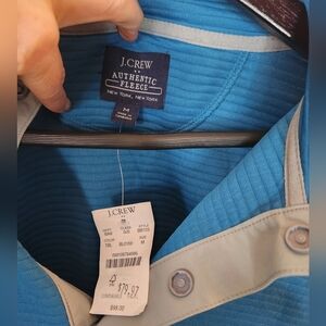 Stay warm and stylish with this blue NWT J.Crew quarter-button men's sweater. Perfect for casual outings or layering in cooler weather. Size medium.
