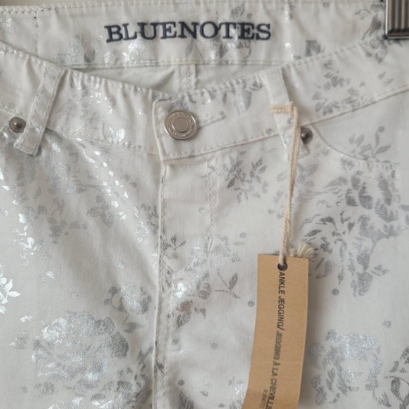 Looking for a stylish and comfortable pair of jeggings? Look no further than these new with tags Bluenotes Ankle Jeggings in a summer-ready white with silver metallic floral pattern.