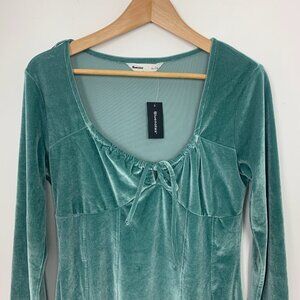 Soft and comfy velour mini dress with long sleeves and a flattering ruched bustier top. Scoop neckline, body-skimming silhouette, and a short hem make it perfect for cozy nights out or styled with boots for a retro vibe.