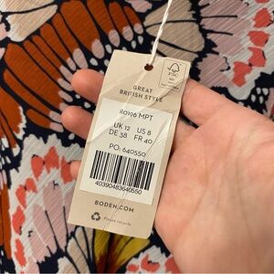 Brand new with tags. Pretty patterned skirt by Boden. Concealed side zip. Built in slip. Regular $190. Sold out style. Has a run in the pattern, as seen in the last photo. Size 8.
