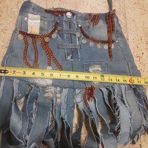 Brand new purse with tags. Zippered closure. No inside pockets just one open area. Made with recycled jeans. There are also red bead decorations added to it. Jean fringe at the bottom of the purse. Makes a slight jingle noise. Gypsy vibes.