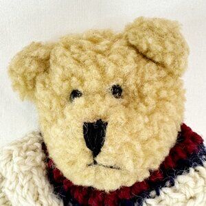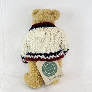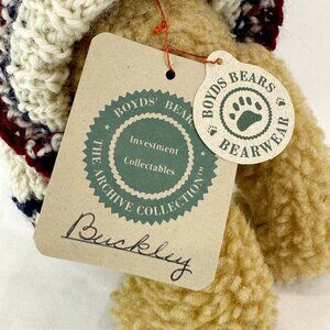 Boyds Bear new with tags and original price tags. His name is Buckley in a cream, red and blue knit sweater 8.5 inches tall. He is handmade, fully jointed. He has a black embroidered nose and mouth. He has soft velvet paw pads slightly darker his fur. The sweater is removable.