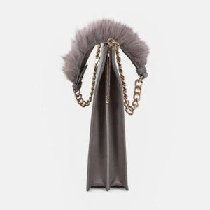 A refined shoulder bag with a chain and faux-fur insert, courtesy of Celine Dion. Made of embossed leather, this bag combines luxury and femininity, well-designed for organization. Fabric: Embossed leather-like. Leather-like shoulder bag. Gold-tone hardware. Raw painted edges. Interior: multiple pockets. Polyester twill lining. Signature Soundwave. Céline Dion Collection dust bag included. Care: wipe a damp cloth.