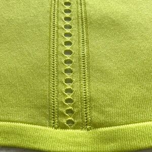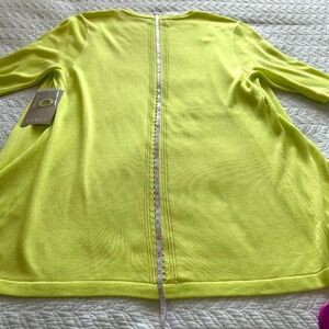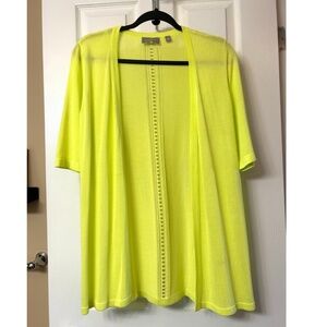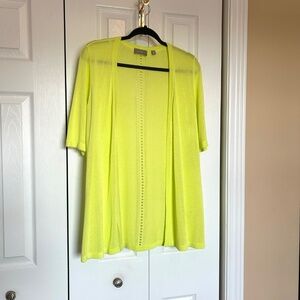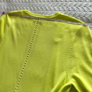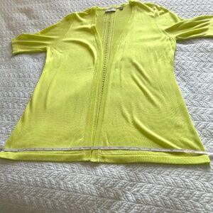 Lightweight Silky Knit Cardigan Perfect for summer with short sleeves! Anything but basic, this features a great pop of color (lemon-lime green) and large pointelle detail down the back. 100% Viscose knit, hand wash, lay flat to dry. Size is Medium. Approx flat measurements: Bust 19.5”, Hip21”, Sleeve 13”, Shoulder16”, Length28.5”. New with tags and never worn, no flaws. Original retail price US$70/ CAD$105