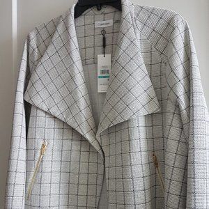 Brand new, never worn with original tag Calvin Klein Flyaway style lightweight jacket in size 0X. Black and off white windowpane pattern with gold tone hardware. Side zip pockets. From Macy's. Original price $119 US.