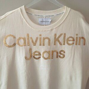 NWT Calvin Klein Jeans cotton blend cream beige sweatshirt with gold sequin logo branding